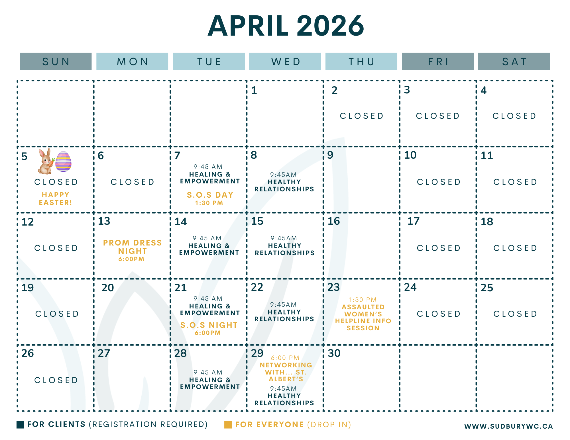The Sudbury Women’s Centre offers a wide variety of FREE programs and supports designed to assist women, girls, and gender diverse individuals in our community.